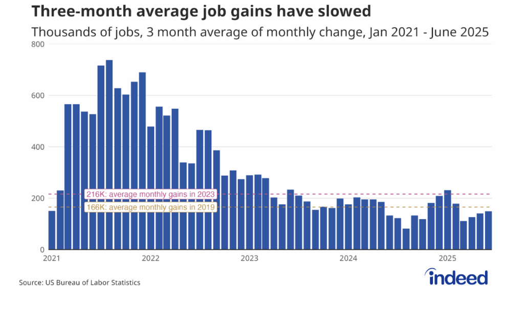 The policy environment is adding further complexity. President Trump’s trade and immigration strategies are beginning to affect both labor supply and employer behavior. Multiple economic forecasts, including from the Federal Reserve Bank of Philadelphia, anticipate a slowdown in job growth during the second half of 2025. Pantheon Macroeconomics expects the monthly average to fall to just 75,000 jobs, a level that would reflect weak demand for labor by historical standards. Others, including J.P. Morgan, warn of potential negative payroll prints in coming months, even if a full employment contraction on a quarterly basis remains unlikely. A significant risk is that reduced immigration, already visible in a declining foreign-born workforce over the past three months, may impair employers’ ability to fill vacancies, particularly in sectors such as agriculture, construction, and hospitality.