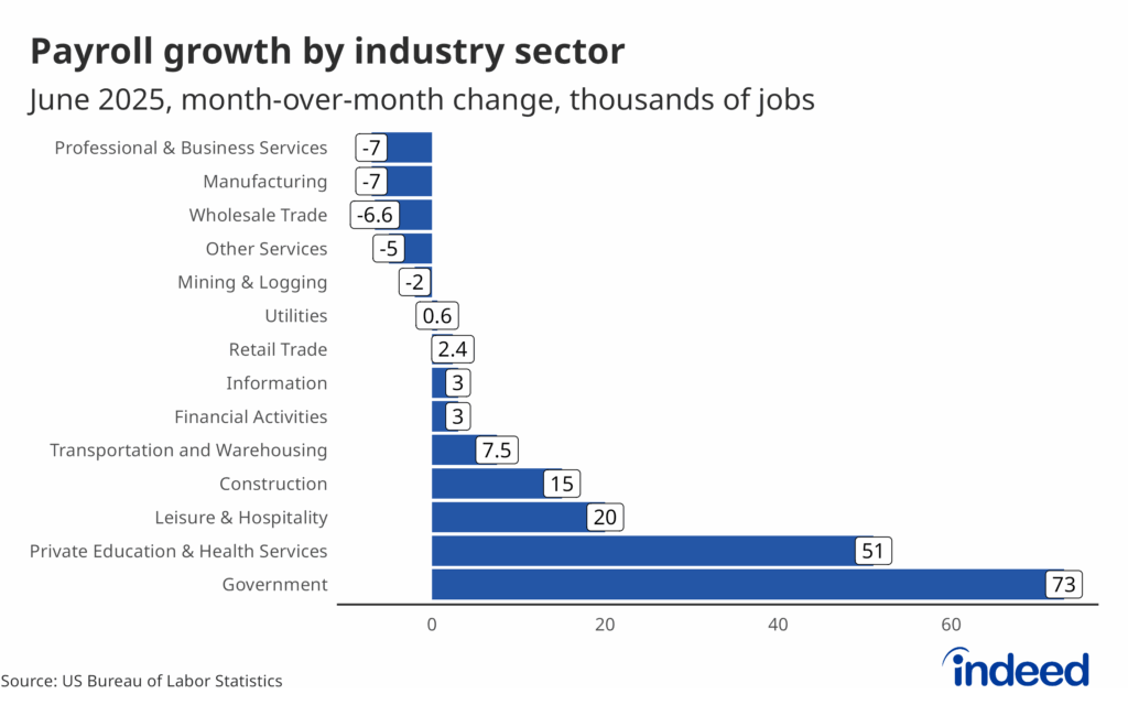 The current pattern of job gains is heavily concentrated. Nearly 94 percent of June’s net employment growth came from just two sectors: healthcare and social assistance, and state and local government, especially public education. These gains reflect continued demand in essential services, but they also mask broad stagnation across most private sector industries. According to ADP data, private sector employment actually declined by 33,000 in June, driven largely by service sector job losses. This bifurcation is critical, as it suggests that most of the labor market is either treading water or deteriorating, despite government-supported segments continuing to expand.
